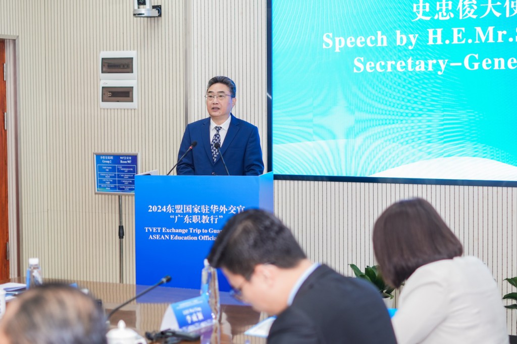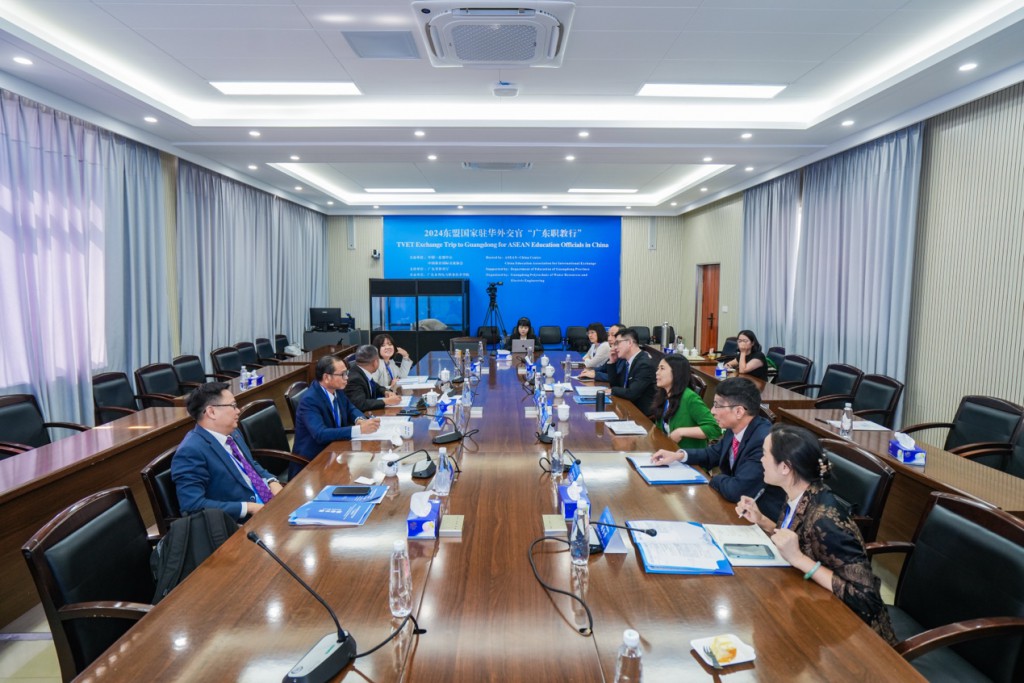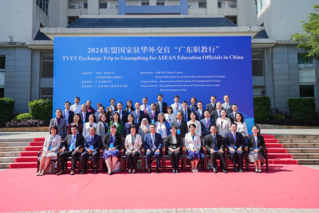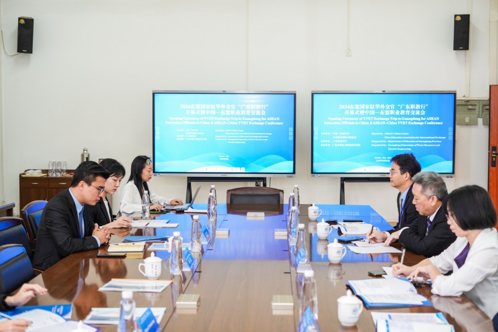 10月23日上午,2024年东盟国家驻华外交官“广东职教行”活动开幕式暨中国—东盟职业教育交流会成功举办。本次东盟国家驻华外交官“广东职教行”活动由中国-东盟中心、中国教育国际交流协会联合主办,广东省教育厅大力支持,广东水利电力职业技术学院承办。中国-东盟中心秘书长史忠俊大使、中国教育国际交流协会副秘书长安延、广东省教育厅二级巡视员吴艳玲出席活动开幕式暨中国—东盟职业教育交流会现场并致辞。来自东盟印度尼西亚、马来西亚、泰国、老挝等9个国家驻华使馆的教育官员和广东10所综合性大学、高等职业院校代表齐聚广东水利电力职业技术学院,交流互鉴职业教育模式与实践,进一步推进广东与东盟国家职业教育合作。