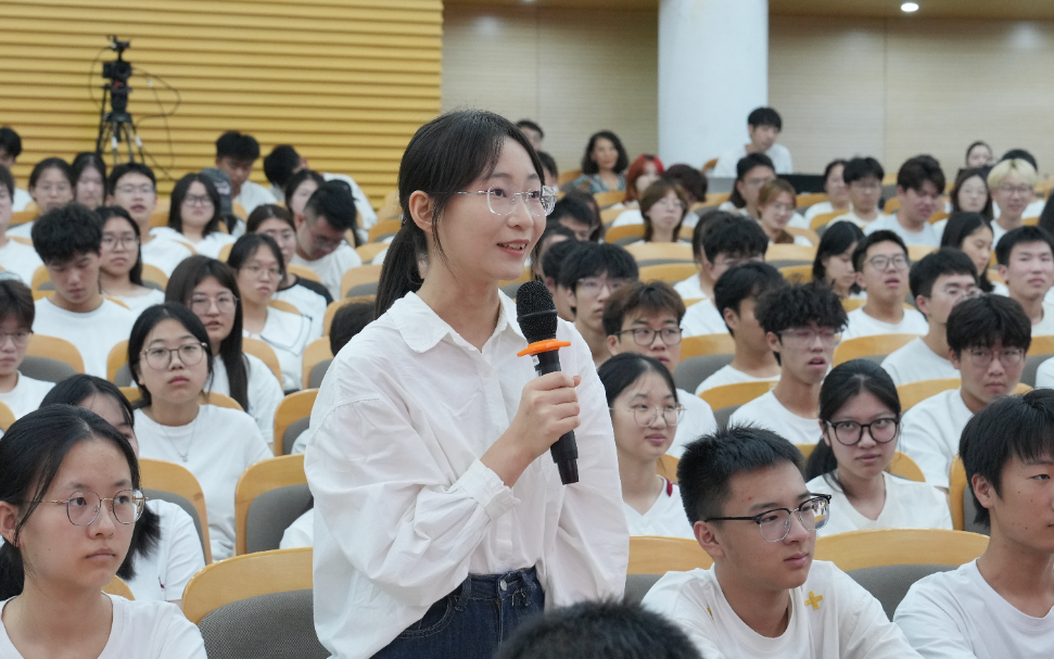 陈文岳从历史、科技、文化三个层面展开论述,引导同学们将人生理想融入中国式现代化伟大征程,找准“价值坐标”。他回顾抗战历史,强调铭记牺牲和传承英雄精神的重要性,号召同学们将抗战精神融入强国建设实践。他向同学们介绍了国家“人工智能+”行动目标与杭州人工智能创新高地建设规划,并详细阐述了学校在AI领域的布局,鼓励同学们拥抱AI浪潮。他说,文化是民族生存和发展的重要力量。他建议同学们观看《文化的力量——习近平文化思想在浙江的溯源与实践》同时引导同学们了解学校“融・善”校园文化理念,坚定文化自信。围绕“行动坐标”和“奋斗坐标”,陈文岳现场与新生们积极互动:“你觉得我们为什么升格为大学?”“你认为好大学是什么样的?”“你认为我们学校和你心目中的好大学还有哪些差距?”在一问一答的过程中,引导同学们从“行动”层面思考如何融入学校发展,从“奋斗”层面明确个人成长方向,让奋斗目标逐渐清晰。陈文岳表示,学校将把建设“复合型人才培养高地”“高能级技能服务高地”“立地型科技创新高地”作为未来发展目标,也希望同学们把奋斗目标融入学校高质量发展。他以优秀校友事迹,号召同学们做心怀“国之大者”、德技并修的人才,激励同学们勇做青春追梦人。