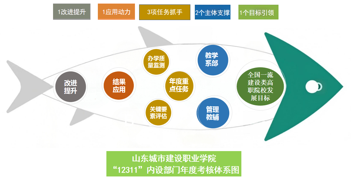 “1”以全国一流建设类高职院校发展目标为引领;“2”以教学系部、管理教辅考核主体为支撑;“3”以办学质量监测、关键要素评估、年度重点任务完成质量为抓手;“1”以考核结果应用为动力;“1”以优化改进促提升。合理设定考核指标,以考核激励,促内生动力,保障学校发展目标达成。