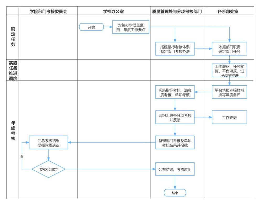 一是考核流程清晰化。依据流程图进行质量管理平台“部门考核工作模块”设置,确保考核流程清晰、可实施、可追溯。围绕确定任务、实施任务(调度)、年终考核三个步骤,明确学校各系部处室的责任、任务、时间节点、质量要求等。