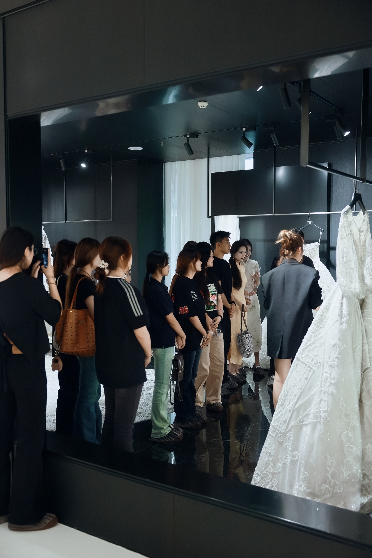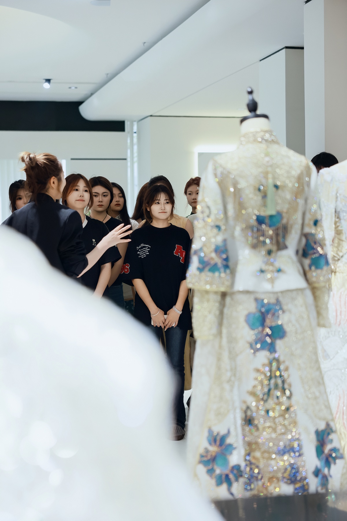 “从婚纱的蕾丝纹样到礼服的刺绣细节,每一处都藏着东方美学的巧思!”活动伊始,即白婚纱店的工作人员化身“美学向导”,带领00后学子开启了一场沉浸式参观。同学们一边聆听店员对婚纱剪裁、面料肌理的细致讲解,一边驻足观察那些融入祥云、牡丹等中国传统元素的设计,不时发出“原来传统纹样能这么美”的赞叹,现场满是年轻一代对东方美学的好奇与向往。
