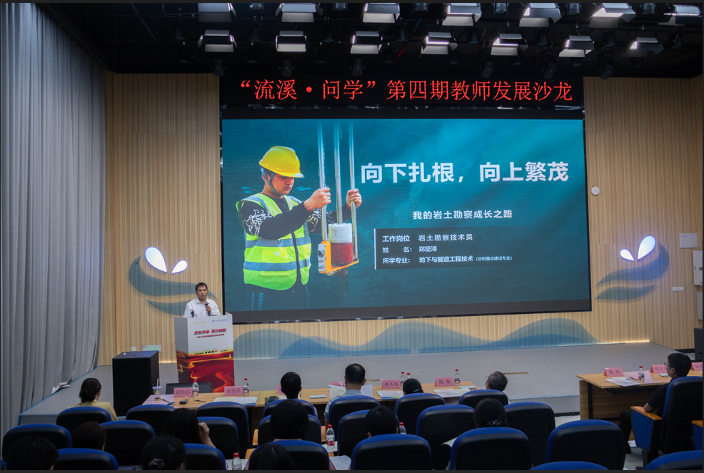 育人成效的生动体现贯穿始终。优秀毕业生郑坚泽以“向下扎根,向上繁茂——我的岩土勘察成长之路”为题,深情讲述了在校期间思政教育的滋养如何助力其职业成长,表达了扎根一线、服务社会的决心。