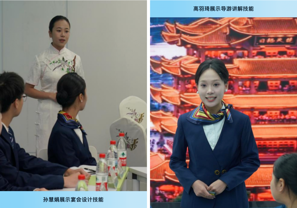 酒店专业学生孙慧娟化身“宴会设计师”,凭借精巧的桌艺布局、创意的餐具搭配,将专业知识与审美素养融入每一处细节,呈现出一场兼具实用性与艺术性的宴会场景设计。旅游专业学生高羽琦则以“金牌导游”的自信,用流畅的语言、饱满的热情讲解黄鹤楼景点,从历史背景到文化内涵,从游览路线到服务贴士,尽显扎实的专业功底与良好的沟通能力。