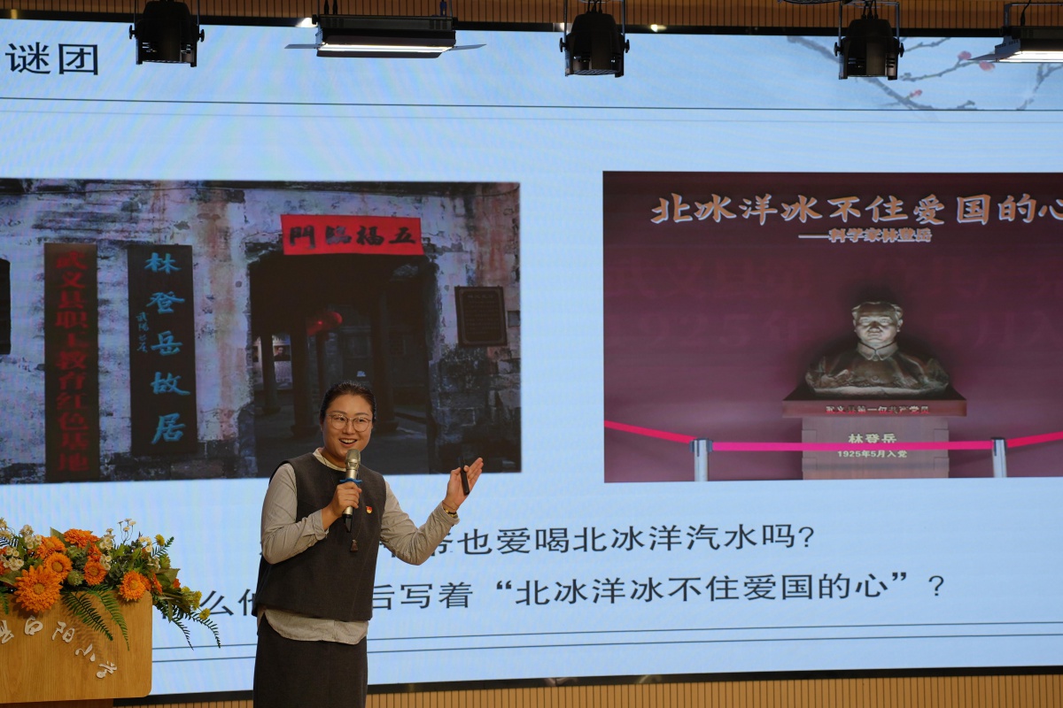 按照“扎根地方文化、传递榜样力量、厚植思政情怀”的精神要求,两校师生围绕“武义红色六杰”的榜样力量,共同开展了“师生同上一堂课”:金职大马克思主义学院教师闫百灵为小学生们讲了林登岳的光辉事迹,从“爱国情”和“科学志”两方面解密了林登岳那颗“北冰洋都冰不住的爱国心”;金职大师范学院的曹杨译驰讲解了“农业报国”的著名农业科学家方悴农先生的光荣一生,让现场观众从“一粒稻种”看到了共产党人的“一生赤诚”;白阳小学的童霞老师带来了微党课“潜伏敌营的红色利剑——徐强的隐蔽战线传奇”,沧海横流,方显党员本色,隐蔽战线,更见信仰坚定。白阳小学学生合唱的《卢沟谣》,稚嫩的歌声带领大家穿越时光回到了烽火硝烟的战争年代,感受革命先辈的坚定信念和无私奉献。