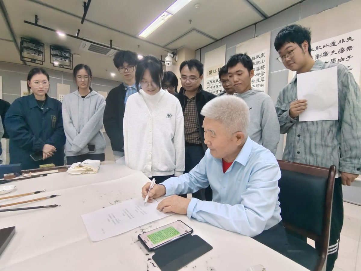 10月31日下午,85岁高龄的中国工程院院士、清华大学教授、中华诗词学会高工委主任王玉明院士飞抵杭州后,即刻奔赴浙江经济职业技术学院,出席第三届“华枝春满”艺术教育成果展。观展间隙,应邀题写展名“华枝春满”时,院士以隶书创作,三易其稿的执着身影,尽显治学匠心。