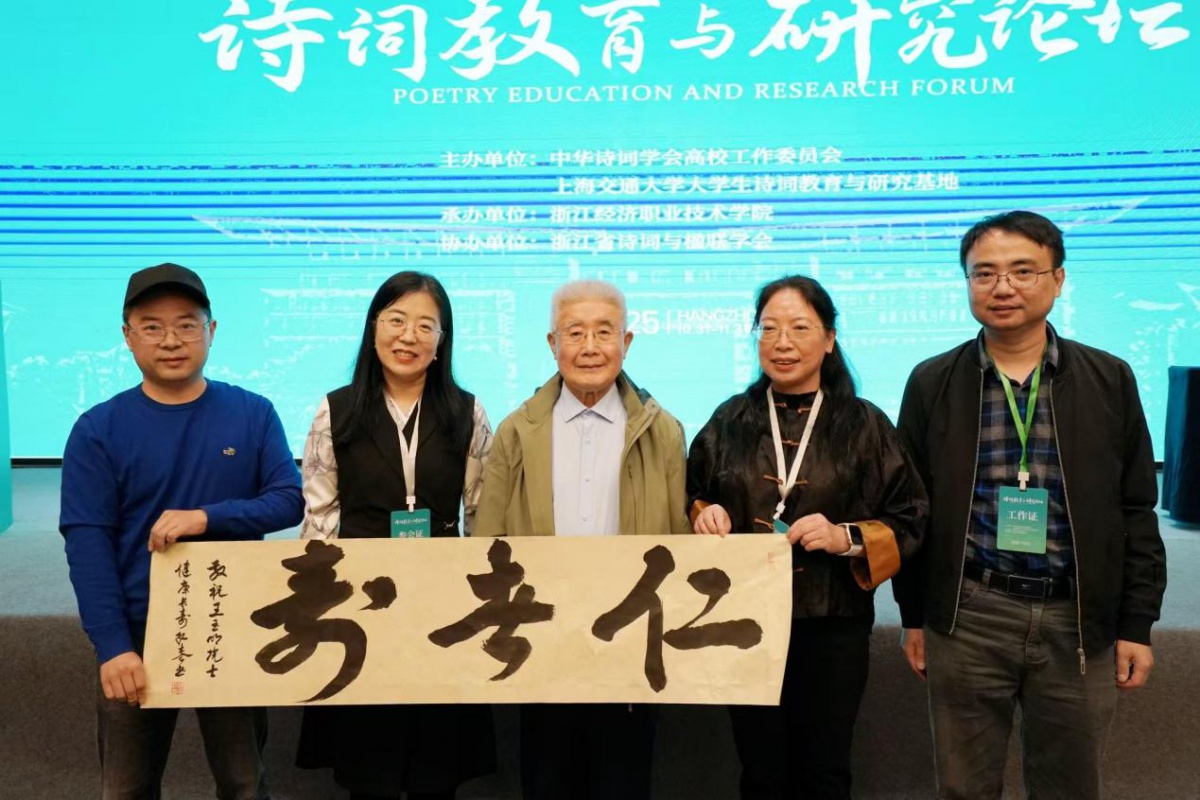 浙经院坚持以文化人,积极构建基于和谐职业人理念的文化素质教育体系。倡导“以传统文化为依托,诗教为特色,兼容诗、书、画,并蓄文、史、哲的人文教育新模式”,构建“一体、两翼、三阶、四质、五德、六能、七化”的现代和谐职业人才培养体系,获得国家教学成果奖一等奖、教育部普通高等学校优秀校园文化建设成果特等奖(全国高职唯一)。这一次,又携手中华诗词学会高校工作委员会,于10月31日至11月3日在杭州承办诗词教育与研究论坛,从而也有了王院士在浙经院题词改诗的动人事迹。