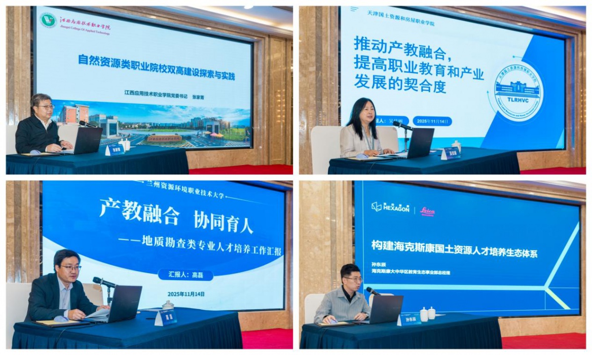 研讨环节中,行业专家学者围绕职业教育创新发展展开深度交流。中国自然资源经济研究院地质勘查行业研究所副所长周鑫以《地质勘查行业发展与形势展望》为题作主题报告,江苏旅游职业学院党委副书记、院长周丽以《跨界融合视角下餐旅类人才培养的创新实践》为题作主题报告,全国国土资源行指委副主任委员、江西应用技术职业学院党委书记张家菁以《自然资源类职业院校双高建设探索与实践》为题作主题报告,天津国土资源和房屋职业学院党委副书记、院长吴佳丽以《推动产教融合,提高职业教育和产业发展的契合度》为题作主题报告,兰州资源环境职业技术大学地质与珠宝学院党总支书记高磊以《产教融合 协同育人一一地质勘查类专业人才培养工作汇报》为题作主题报告,海克斯康教育生态事业部总经理孙东辰以《构建海克斯康国土资源人才培养生态体系》为题作主题报告。六位专家的报告内容涵盖职业教育标准建设、餐旅类人才培养创新、“双高建设”路径、产教融合实践等关键领域,为与会者提供了兼具理论高度与实践价值的经验借鉴。
