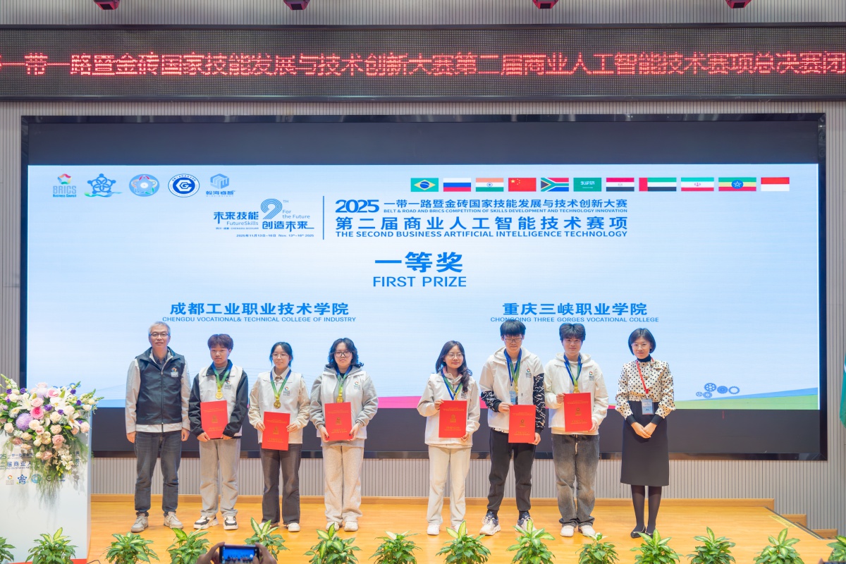 11月16日,2025“一带一路”暨金砖国家技能发展与技术创新大赛之第二届商业人工智能技术赛项总决赛在成都工业职业技术学院金堂校区圆满闭幕。本次大赛吸引了来自中国、孟加拉国、哈萨克斯坦、泰国、阿富汗、苏丹共和国、加蓬、喀麦隆、印度尼西亚、巴基斯坦、新加坡、科特迪瓦等12个国家的75支参赛队伍(68支国内队、7支国际队)同台竞技。