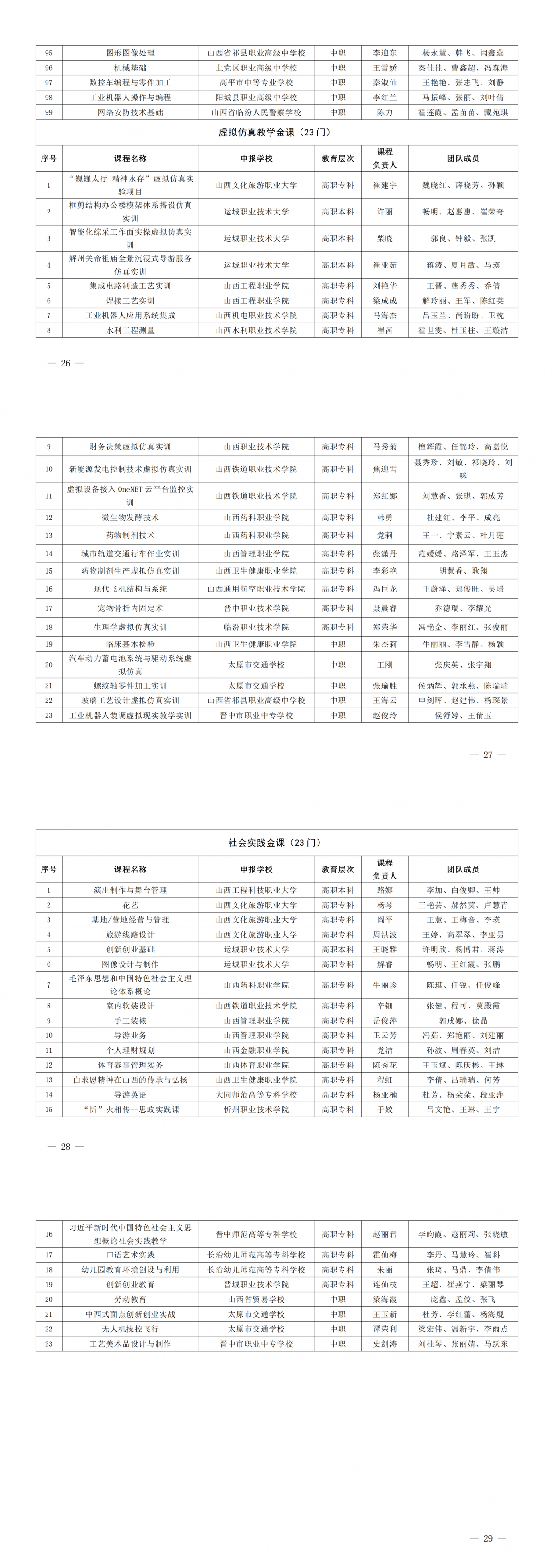 根据《山西省教育厅关于实施山西省职业院校 “ 职教金课”建设的通知》( 晋教职成〔2025〕22号),经专家评审和网站公示,决定认定 2025 年度省级职业教育 “金课”498 门,其中,线上 “金课”65门、线下 “金课”288门、线上线下混合式 “金课”99门、虚拟仿真教学 “金课”23门和社会实践“金课”23门。现将名单予以公布( 见附件)。