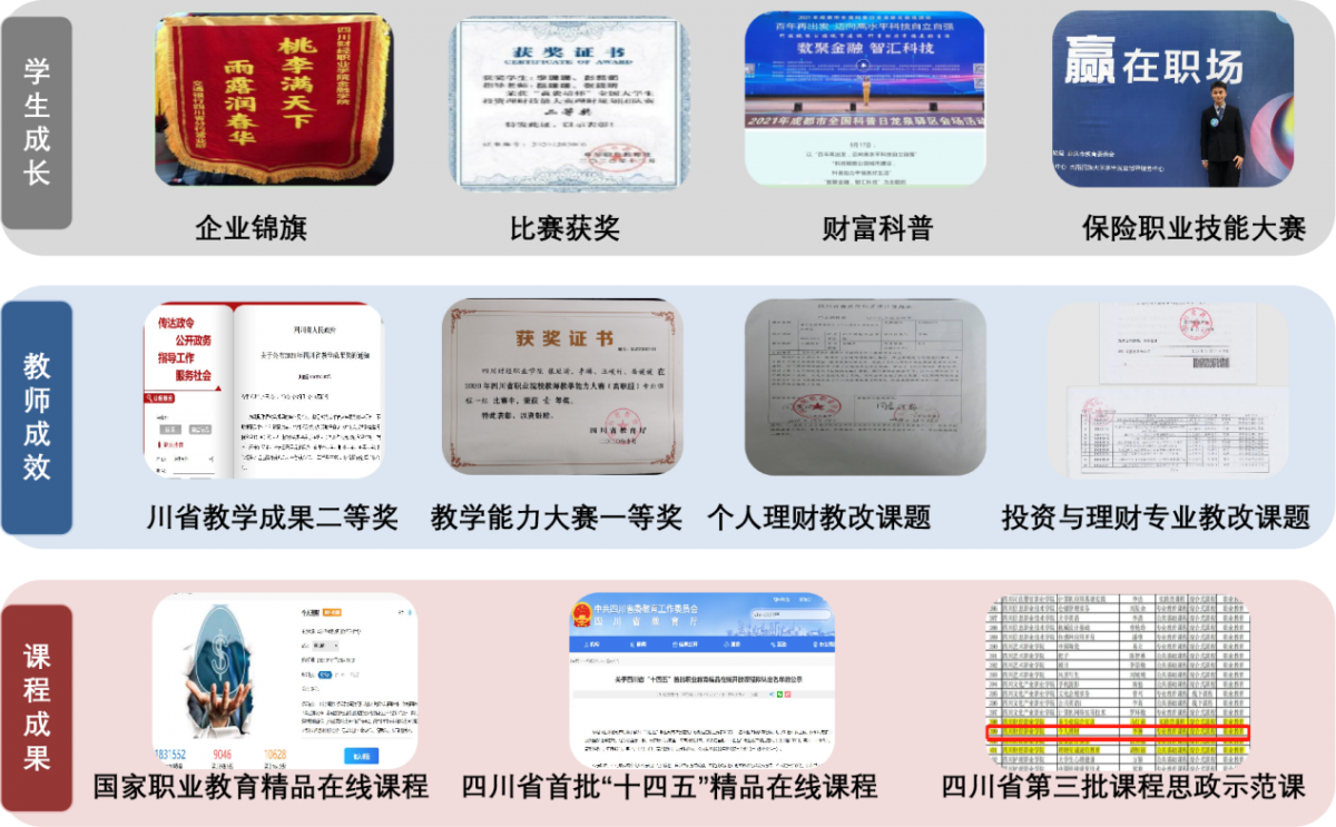 深化岗课赛证:对接理财岗位标准(课岗融通)、职业技能大赛(课赛融通)及1+X证书(课证融通)。1+X健康财富规划证书通过率达95%以上,学生在省级以上职业技能大赛中获奖8次。