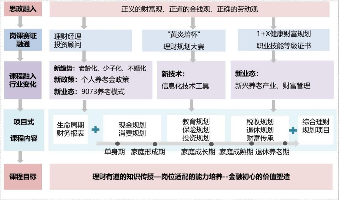四川财经职业学院金融类专业(财富管理、金融服务与管理、金融科技应用)核心课程《个人理财》以立德树人为根本任务,创新构建“正义的财富观、正道的金钱观、正确的劳动观”价值引领(“三观”),通过“社会热点线、从业分享线、法律政策线”三线融合(“三线”),将思政教育深度融入专业教学全过程。该课程紧密对接财富管理行业人才需求,聚焦理财经理等岗位核心能力,不仅在专业教学上精益求精,更在价值塑造上深耕细作,形成了特色鲜明的思政育人模式。课程建设成果显著,获评国家职业教育精品在线开放课程、四川省课程思政示范课等多项荣誉,学生认可度高、职业能力提升显著,为培养德才兼备的高素质金融技能人才提供了可借鉴的宝贵经验。