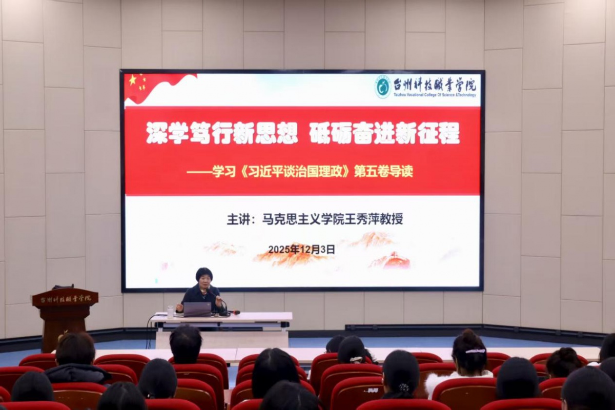 2025年12月3日晚,“真理的味道”嘉木先锋思政大讲堂第18期在台州科技职业学院图书馆报告厅隆重举行。本期讲堂特邀马克思主义学院教授王秀萍作题为《深学笃行新思想,砥砺奋进新征程——学习〈习近平谈治国理政〉第五卷导读》的主题报告,为马克思主义学院社团“学‘习’会”成员带来了一场思想深刻、内容丰富的理论盛宴。