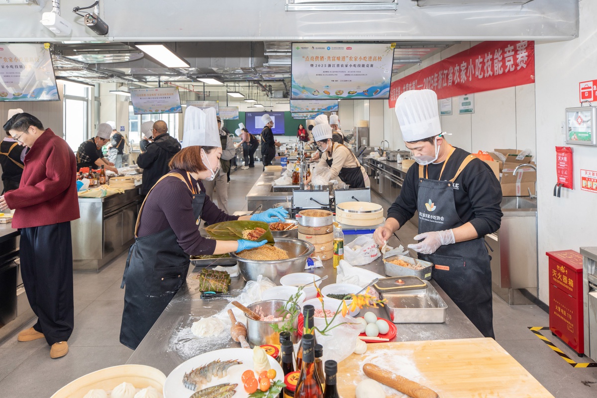 比赛现场,来自各地市的42名选手同台竞技,充分展示出高超的烹饪技艺和厨艺实力,为大家呈现各色美味小吃,彰显中华美食的独特魅力。赛事设置中式面点制作与农家特色小吃制作两大环节,分最佳风味、造型、技艺、创意四大维度展开比拼。各地选手展现了精湛技艺与地域特色,多项融合传统与创新的小吃作品获得了现场专家与师生的一致好评。最终,各市总分第一名的选手荣获“2025年度浙江省十佳特色农家小吃”称号。