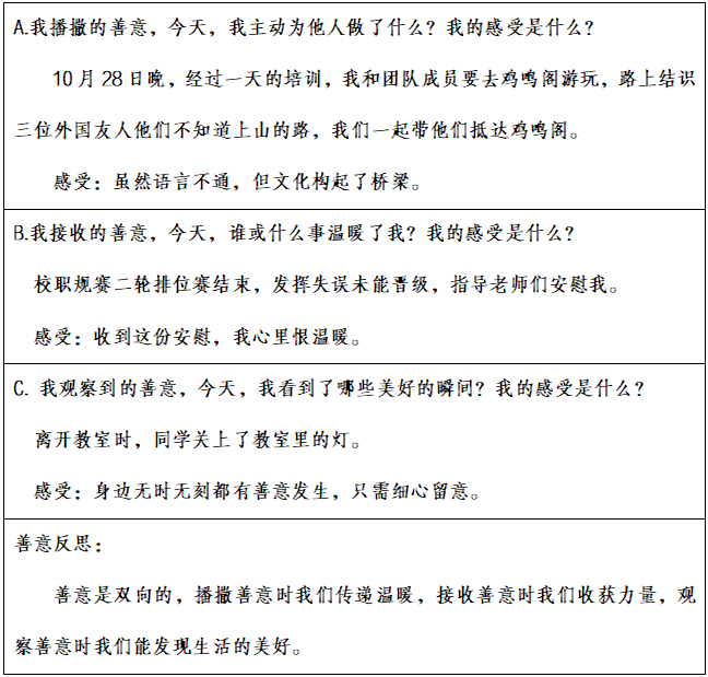 “为忘带卡的同学刷饭卡”“认真倾听害羞同学的发言”“收到室友带的早餐”……这些看似微小的瞬间,被学生一一记录在结构清晰的“善意日志”模板中。项目提出“涟漪效应”理念,鼓励每位学生成为善意的“石子”,通过“给予—接收—观察”三个维度,增强对生活的觉察与感恩。日志不要求长篇大论,只需真诚记录,降低了参与门槛。配套提供的“善意行动清单”更将抽象善意转化为具体行为,推动心理建设从认知走向行动。