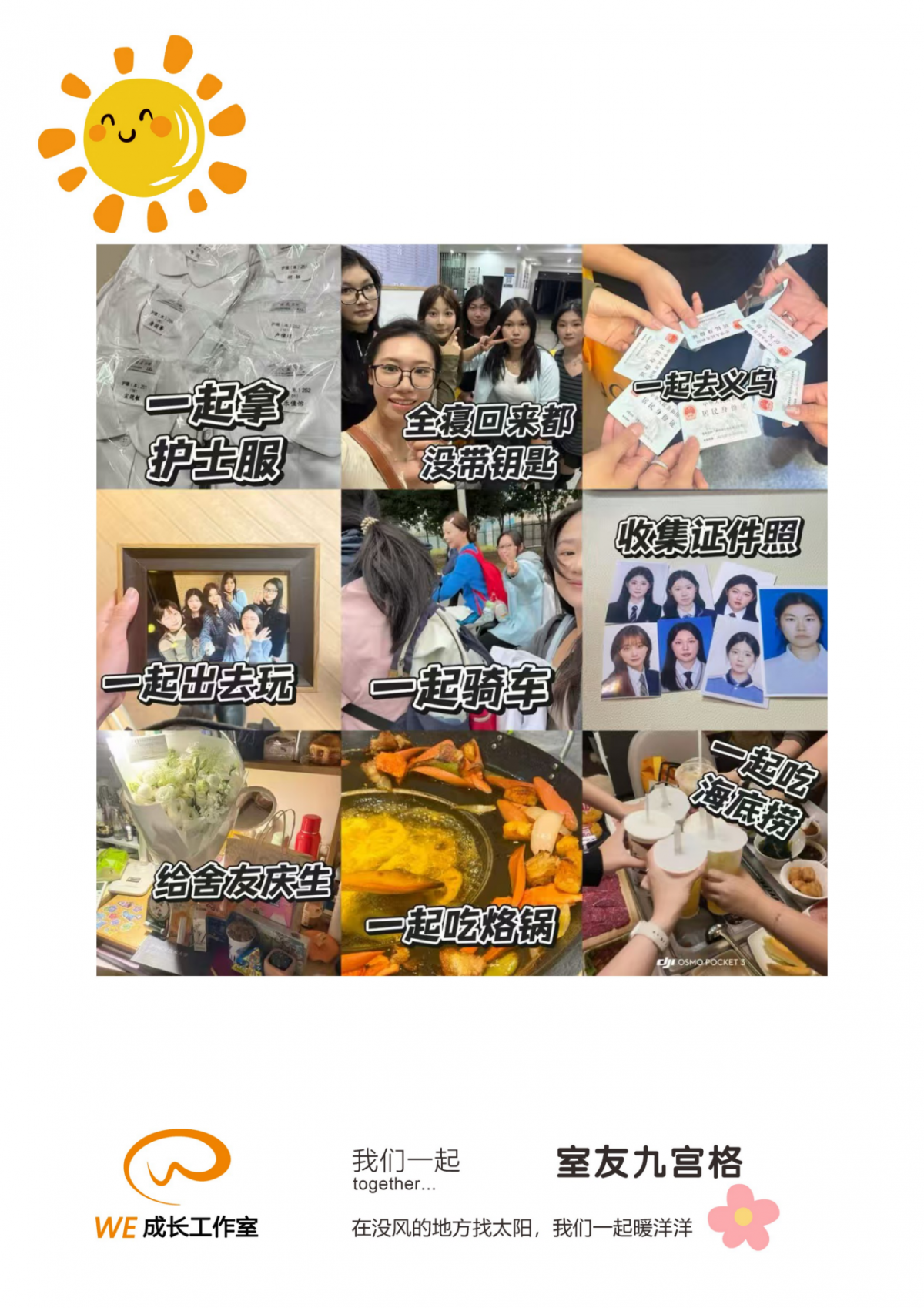 “和室友一起完成九件小事并拍照打卡”,这一简单而有趣的规则,激发了寝室的共创活力。从一起晨读到共庆生日,从合作整理到户外运动,九宫格不仅记录了美好时光,更在合作中深化了彼此的理解与支持。活动覆盖多个学院与楼栋,形成了“一寝带一寝、一层暖一层”的辐射效应,使心理建设在最小生活单元中扎根。