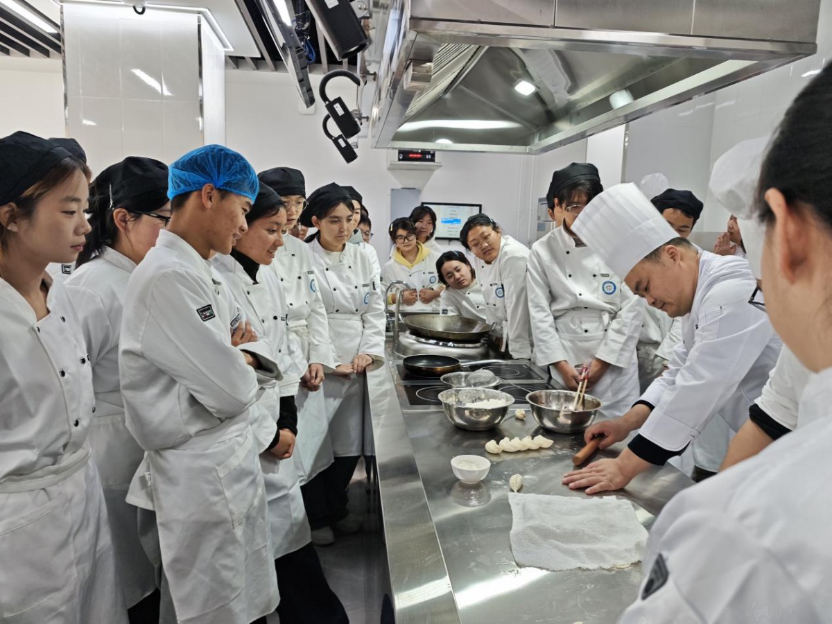 实训环节氛围热烈。陈老师结合南北饮食特色,改良推出冬至过水煎创意馅料,现场演示“麦穗褶”“月牙形”等专业捏制手法,从擀皮力度均匀度到馅料配比精准度,耐心拆解每个技术要点。援疆教师朱威说道:“以技能为桥、以民俗为纽带,这样的跨域协作既传艺更传情,正是边疆职教需要的优质资源对接。”“这不仅是一次技能指导,更是一堂生动的跨域育人课。”塔里木职业技术学院旅游烹饪学院副院长何引表示,学校与浙江商业职业技术学院已建立长期协作机制,“金牌西进”系列活动将持续邀请浙江技能大师、国赛导师开展专题授课,通过技能传承、经验共享,助力边疆技能人才培养提质增效。
