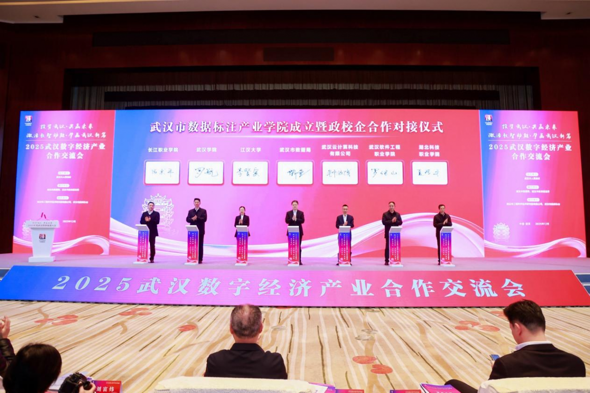 在人才培育闭环构建上,大会再添重磅动作。武汉市数据局副局长薛童牵头,武软副校长罗保山联合武汉云计算科技有限公司及武汉学院等多所院校代表,共同签约成立武汉市数据标注产业学院。该产业学院将采用“一学院三中心”创新模式,打造集人才联合培养、技术服务输出、创业项目孵化为一体的人才培育闭环。武软将凭借在数据标注、人工智能等相关专业的师资优势、实训资源,实现院校育才与产业用才的“零距离”衔接,为武汉数据标注产业高质量发展提供稳定、优质的人才支撑。