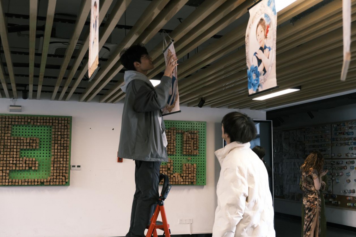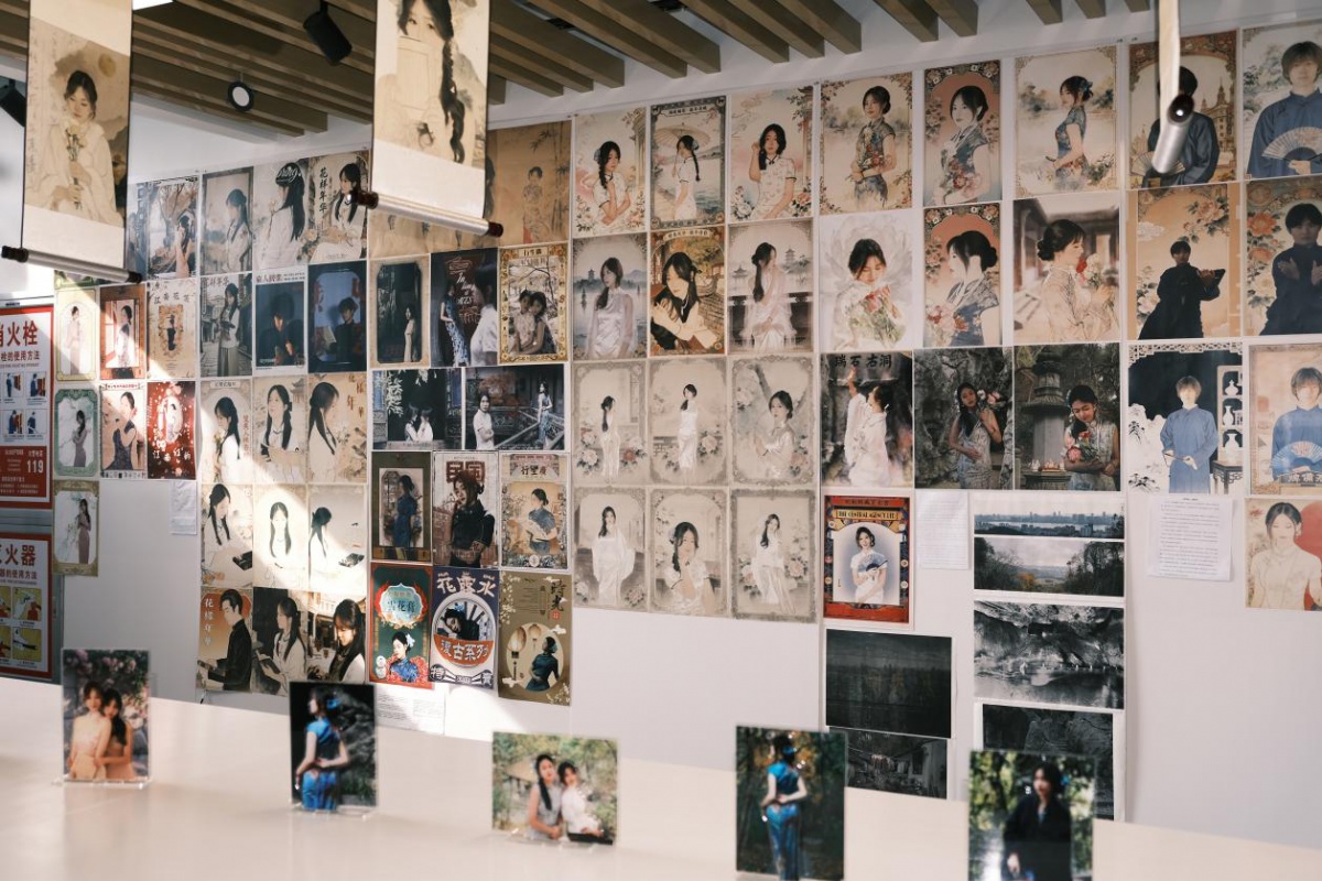 课堂上习得的理论知识、外拍中积累的灵感技法,最终在结课作业中完成了一场惊艳的跨界碰撞。课程打破传统摄影的边界,抛出了一个极具挑战性的命题:让AI技术与“月份牌”这一非遗文化对话,完成一次传统与现代的光影重构。从主题构思、实地取景,到用AI技术调试复古色调、复刻月份牌的经典韵味,再到最终的作品装裱,学生们全程亲力亲为,在技术突破与传统敬畏之间反复打磨、不断精进。展览现场,一幅幅作品宛如打开了时光的闸门:有的以实拍的亭台楼阁为底景,AI技术让现代少女的身影染上月份牌特有的柔美妆面,古亭飞檐与仕女衣袂在光影中交织,古今韵味浑然一体;有的聚焦国画场景,用AI精准还原老上海月份牌的印刷质感,复古风情扑面而来。每一幅月份牌作品的拍摄与制作,都藏着同学们对非遗文化的热爱与思考。“以前觉得月份牌老气横秋,没想到通过镜头和AI的结合,能做出这么好看又有新意的内容。”数字媒体艺术专业学生阮佳怡的话,道出了许多同学的心声。