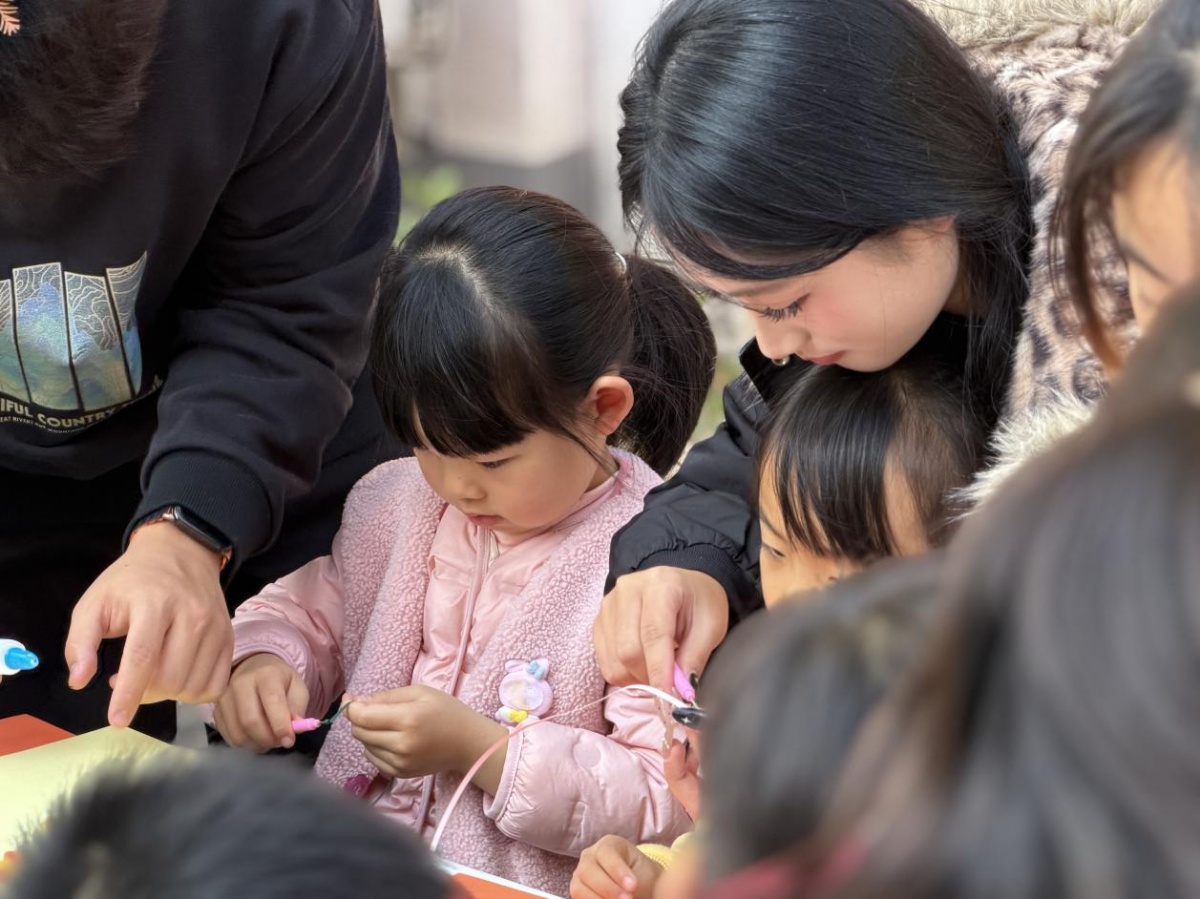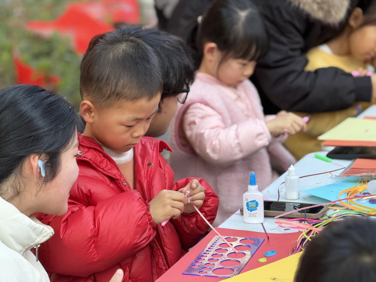 留下幼儿园小朋友的到来,为这场文化盛宴增添了更多童趣。在“小鲁班”志愿者的带领下,小朋友们分组体验迷你福字书写、卡通纹样拓印和简易衍纸制作。孩子们认真的神情引得现场阵阵欢笑,老年书画队的老师们还特意为小朋友们准备了定制卡通福字贴纸,送上专属节日祝福。活动尾声,小朋友们高高举着亲手制作的作品集体合影留念,离场时仍恋恋不舍,频频回头与志愿者挥手告别,让文化传承的种子在幼小心田悄然扎根。