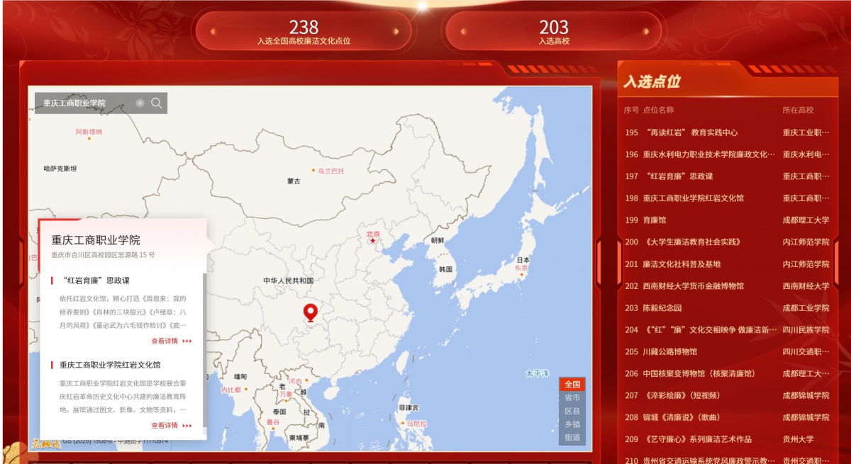 据悉,作为教育部第十届高校廉洁教育系列活动的重要成果,《清风印迹——全国高校廉洁文化地图》首次整合了全国高校的廉洁文化项目,旨在打造可视化、体系化的廉洁教育资源,推动廉洁文化深度融入高校育人体系。本次全国高校廉洁文化地图征集活动历经多层严格遴选,最终确定238个全国高校廉洁文化点位,其中重庆市有8所高校14个点位入选。