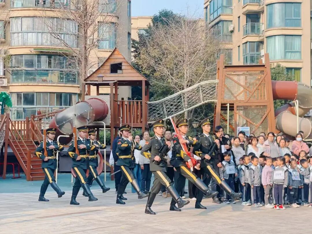 组建教官队伍,传递爱国力量。为进一步延伸爱军爱国主义教育触角,学校依托退役大学生士兵群体,成立了军训教官队,将升旗、军训等活动打造成传承红色基因、弘扬爱国精神的重要载体。教官队不仅承担起新生军训和学校日常及重大节日的升旗任务,在军训、升旗仪式上带领师生重温长征历史、感悟初心使命,还主动走出校园,深入周边幼儿园、中小学开展丰富多彩的升旗、爱国主义宣讲,“我是小小兵”等志愿服务活动,并将升旗仪式服装要求、步伐标准、升旗要领等编印成《儿童仪仗队指导手册》,协助组建儿童仪仗队,定期赴学校进行专业化培训,为幼儿园及中小学注入鲜活的国防教育力量,将爱军爱国的种子播撒在青少年心中,推动形成“校地联动、全民参与”的国防教育良好格局。至今已组织退役大学生士兵仪仗队进学校21所(幼儿园12所、小学8所、中学1所),受教育师生达17000余人,培育学生仪仗队14支,不仅展现了军人的良好风貌,更让广大师生在潜移默化中增强国防观念。