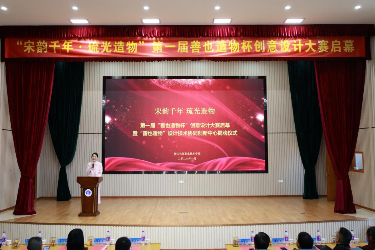 1月7日,“宋韵千年·琉光造物”第一届善也造物杯创意设计大赛暨“善也造物”设计技术协同创新中心揭牌仪式在浙江长征职业技术学院第二报告厅隆重举行。浙江省文化创意产业协会秘书长周卫中,浙江省非物质文化遗产保护协会理事、杭州善也文化创意有限公司负责人夏紫菡,浙江省陶瓷行业协会副主席吴煜敏,浙江省书法家协会理事金耀耿,浙江省知识产权成果转化专家方红军,浙江长征职业技术学院副校长杜宝山、高创宽、冯新红及相关师生代表齐聚一堂,共同见证这一意义非凡的时刻。