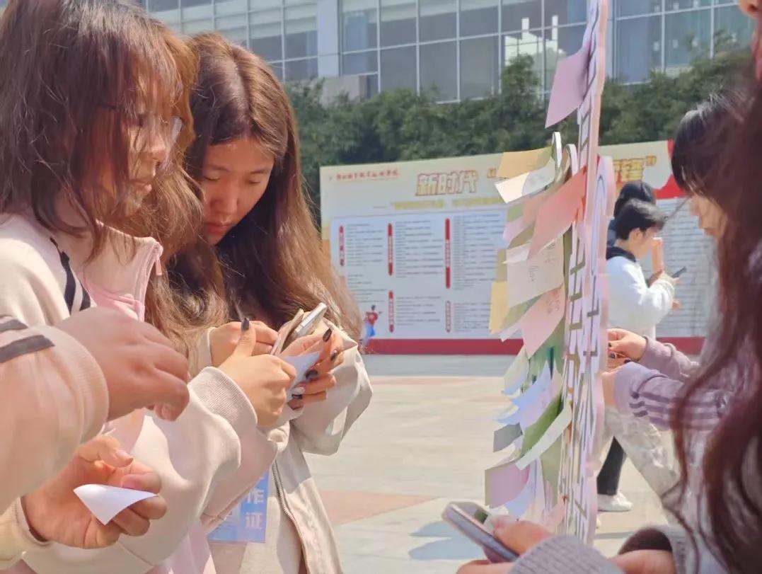 同时,也有同学在“养分补给站”领取彩色便利贴,用彩笔写下了自己对于女性的期许和对未来的祝福。