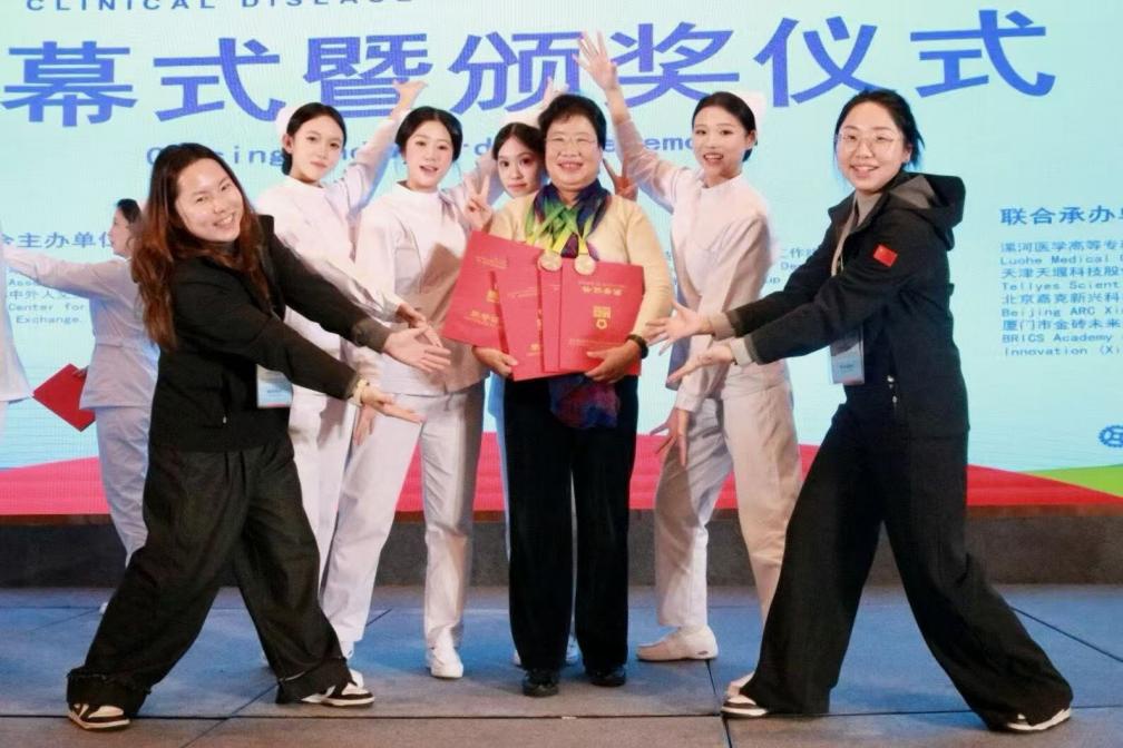 专业技能是护理人才的核心竞争力。护理学院始终坚持“以赛促学、以赛促教”的常态化机制,依托与70余家医院企业共建的实训平台和先进实训中心,构建“双主体育人、多模块强化”培养模式,让学生在实践中锤炼过硬本领。在2025全国“一带一路”暨金砖国家技能发展与技术创新大赛中,学院学子不负众望,两线告捷:王嘉宁、陈伊诺同学在急救护理技能赛项中荣获二等奖;谢渝婷、冯一希等组成的团队在临床疾病护理技能赛项中同样斩获二等奖。