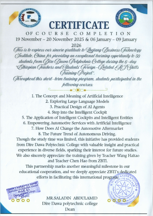 正是这套机制,让师生团队能够沉下心来,在国际化项目中锤炼本领。而这样的产教融合实践,也正在悄然走向更广阔的世界。不久前,埃塞俄比亚德雷达瓦理工学院发来感谢信,对浙江工商职院人工智能学院为其50名学生提供的为期6天的“外籍师生技能培训项目”表示诚挚谢意。培训课程涵盖人工智能概念、大语言模型探索、智能座舱应用、AI如何改变汽车后市场等前沿内容,由陈昊、王海涛两位教师全程授课。信中写道:“尽管学习时间有限,但这次培训为学生们提供了宝贵的见识和实践经验,激发了他们对未来学习的兴趣。”这份跨越山海的信任与赞誉,正是中国职教经验走向国际的生动注脚。