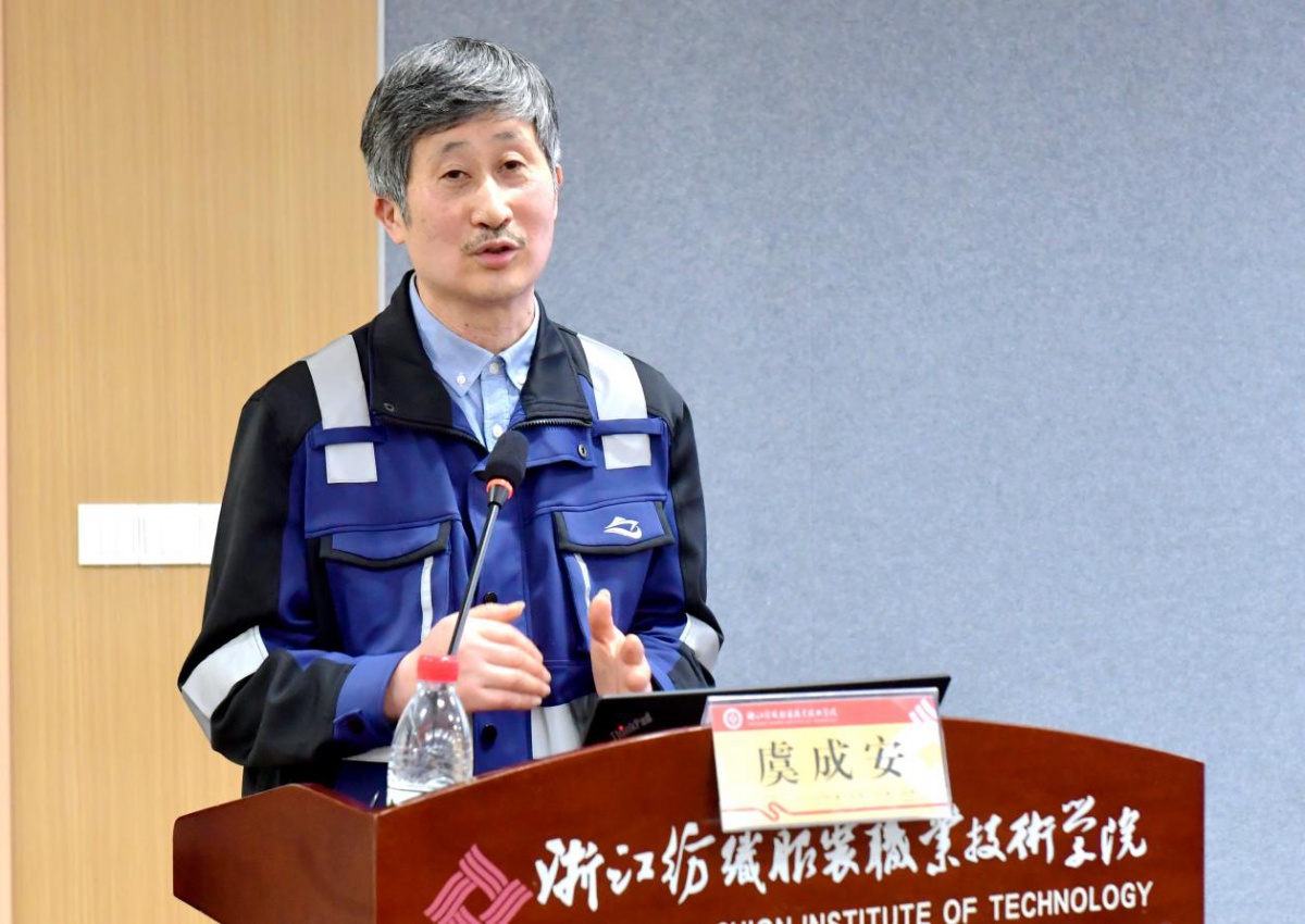 4月8日下午,浙江纺织服装职业技术学院2号楼二楼报告厅暖意融融、掌声不断。由马克思主义学院承办的“红帮·尚美学堂”第十五讲如期开讲,全国劳动模范、全国五一劳动奖章获得者虞成安受邀登台,以亲身经历为教材,为百余名师生带来一场题为《匠心——一名劳模的成长初心与职业坚守》的生动思政课,120余名师生代表共同聆听了这场饱含坚守与热爱的成长分享。