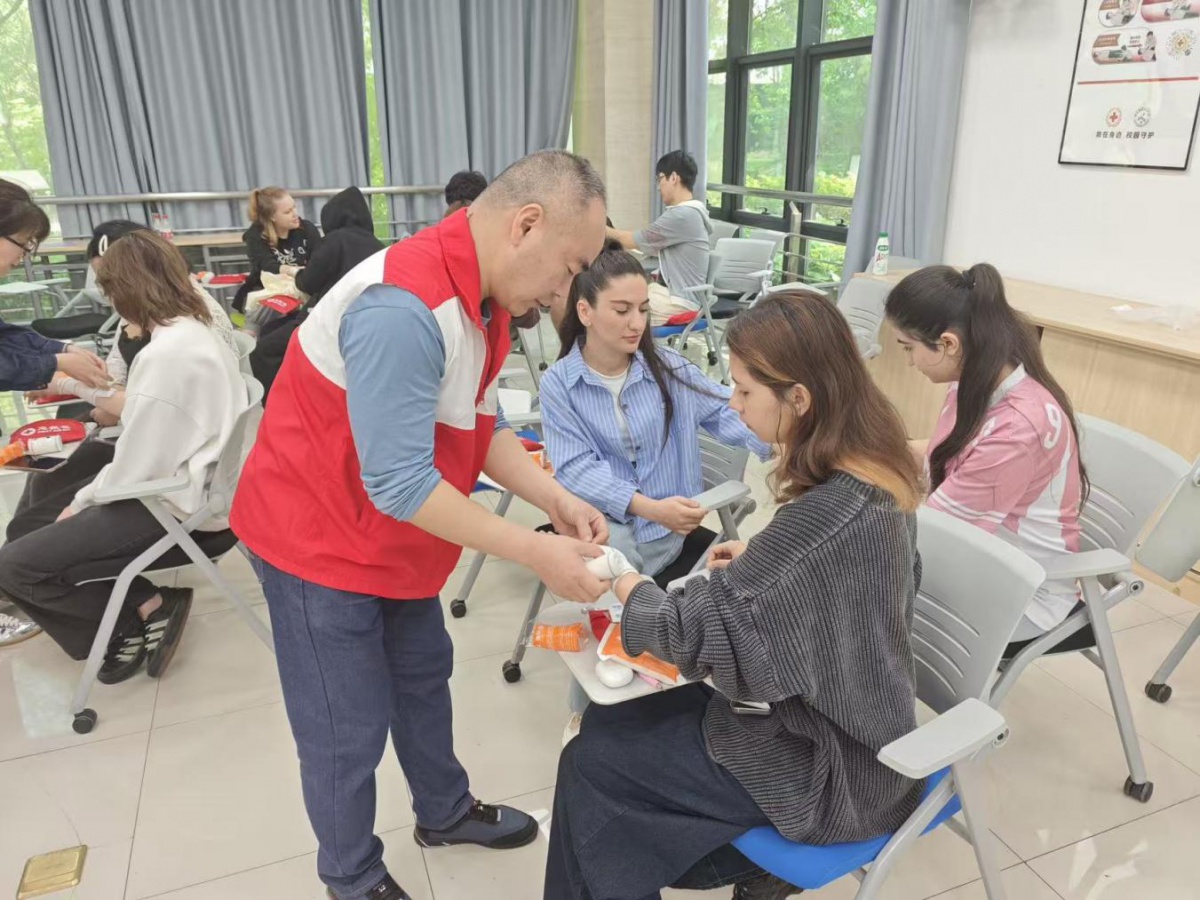 因为存在语言与文化差异,培训期间,学校红十字会培训讲师宋静波和楼靖两位老师采用中英文双语授课,结合图文并茂的课件、现场模拟演练和案例讨论,系统讲解了心肺复苏(CPR)、自动体外除颤器(AED)操作、创伤止血包扎、骨折固定等核心模块。