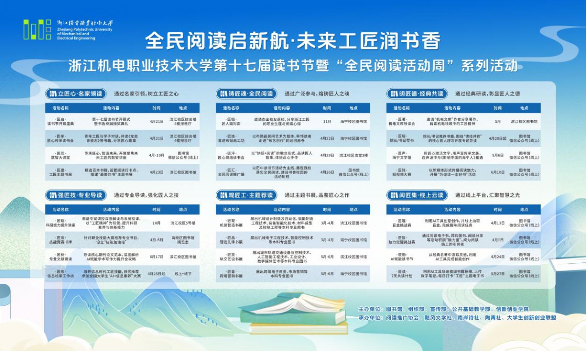 第十七届读书节暨“全民阅读活动周”系列活动将从4月持续至11月,覆盖滨江、海宁两校区,线上线下同步开展。本次系列活动是浙江机电职业技术大学落实《全民阅读促进条例》、推进书香校园建设的重要抓手,未来学校将持续推动阅读融入日常、融入育人全流程,营造“人人皆学、处处能学、时时可学”的校园生态,引导广大青年学生在阅读中增长见识、坚定信念、锤炼本领,成长为堪当民族复兴重任的新时代大国工匠。