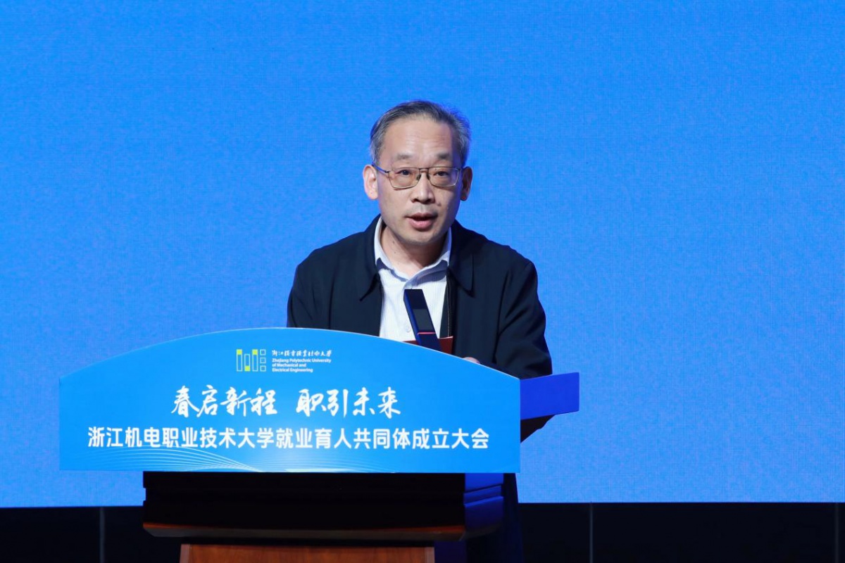 贺星岳代表学校致辞。他强调,浙江机电职业技术大学始终把就业工作摆在突出位置,成立就业育人共同体是整合多方资源、构建就业育人格局的重要举措,也是促进“四链”有机衔接的具体实践,并就共同体建设发展提出三点期望。一是精准对接产业,把企业标准融入人才培养全过程,实现毕业与上岗“零过渡”;二是聚力精准服务,为毕业生就业搭建专属保障平台,为企业精准输送适配人才;三是共建长效机制,打造校政企共生共赢的就业生态,推动政策、人才、技术、岗位资源高效互通。