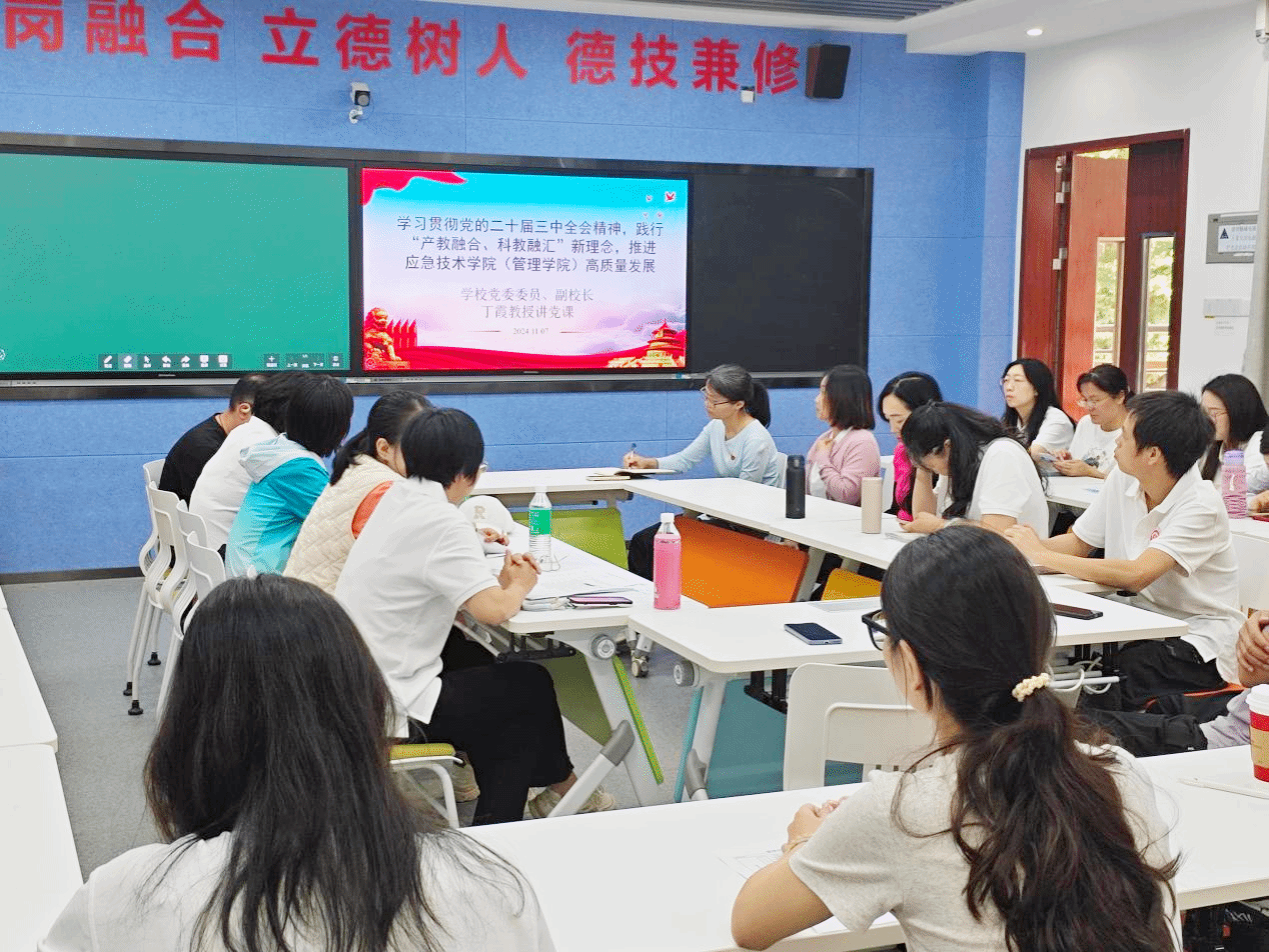 副校长丁霞以“学习贯彻党的二十届三中全会精神,践行‘产教融合、科教融汇’新理念,推进应急技术学院(管理学院)高质量发展”为题,为管理学院党总支全体党员讲授主题党课。丁霞副校长强调,应急技术学院(管理学院)要紧密结合新时代党的创新理论和最新方针政策,不断深化教育教学改革,致力于培育能够适应社会主义现代化建设需求的高素质人才。她强调,全体党员要以“培根铸魂,立德树人”为己任,以“为党育人、为国育才”为目标,通过不断学习提升自身综合素质,充分发挥先锋模范作用,为学院的高质量发展贡献力量。